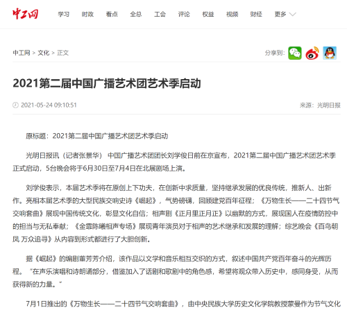 在中國共產(chǎn)黨建黨百年之際,中國廣播藝術(shù)團(tuán)的新老藝術(shù)家齊聚一堂,以藝術(shù)家自己的方式為黨的百年華誕獻(xiàn)禮。新時代,新使命,新征程,中國廣播藝術(shù)團(tuán)將以全新的精神面貌,重新啟程,聚合同心共筑中國夢的磅礴力量,共同實(shí)現(xiàn)偉大的夢想。