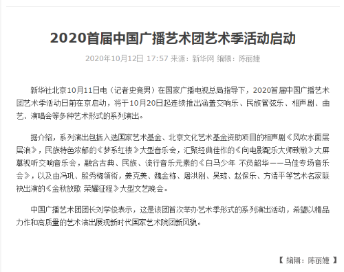 中國廣播藝術(shù)團(tuán)藝術(shù)季,是由中國廣播藝術(shù)團(tuán)打造的優(yōu)質(zhì)演出精品項目,是在廣電總局領(lǐng)導(dǎo)下以習(xí)近平新時代中國特色社會主義思想為指引,積極推進(jìn)文化創(chuàng)造性轉(zhuǎn)化、創(chuàng)新性發(fā)展的重要實(shí)踐,藝術(shù)季以優(yōu)秀的精品力作和高質(zhì)量的藝術(shù)呈現(xiàn)展示新時代國家藝術(shù)院團(tuán)的嶄新風(fēng)采。